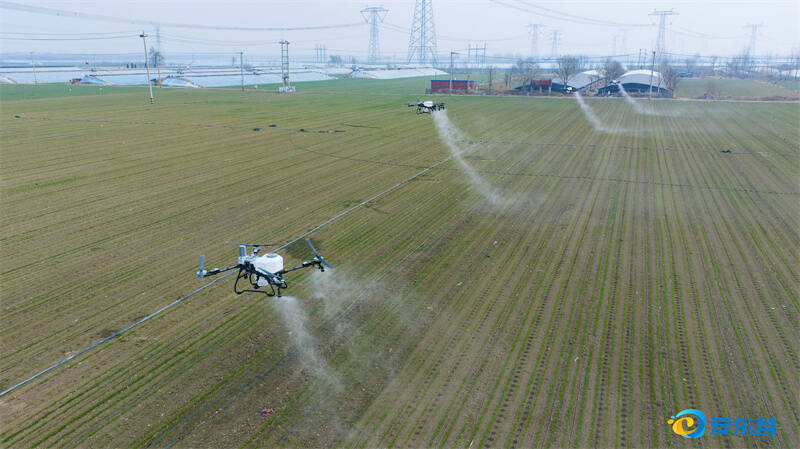 近日,在广饶县大王镇军屯村,植保无人机正在对小麦开展田间防治作业。
